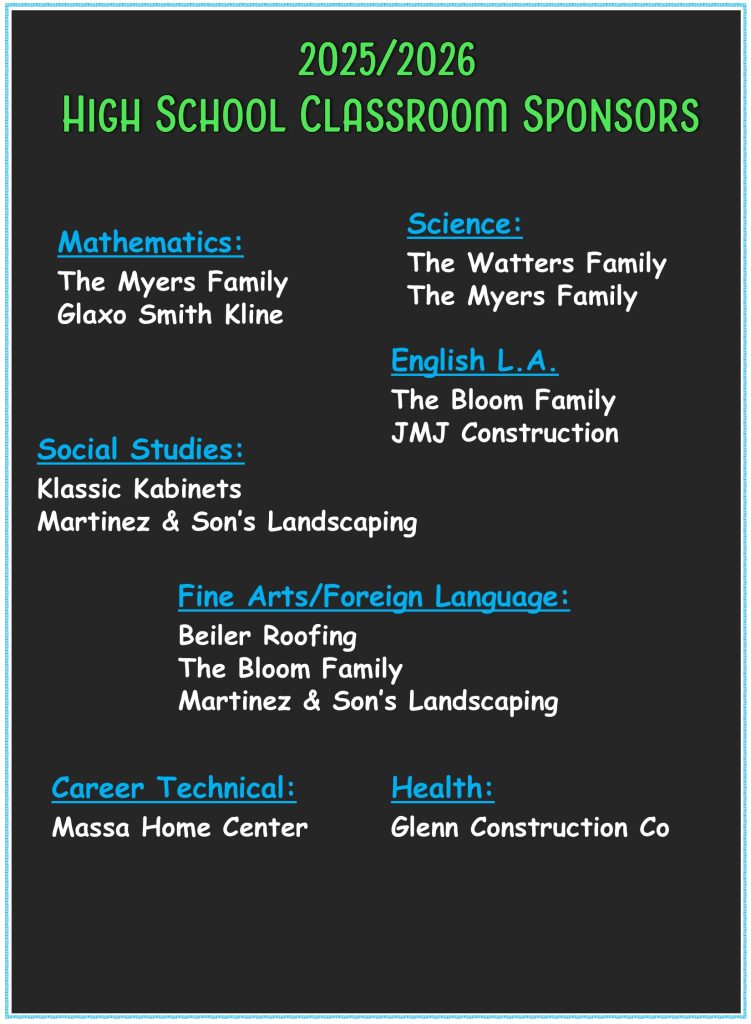 Classroom Sponsorships are tax deductible. Sponsors will have their name/company name displayed near the school offices and district office for the entire school year and receive recognition on the CSF Facebook page.