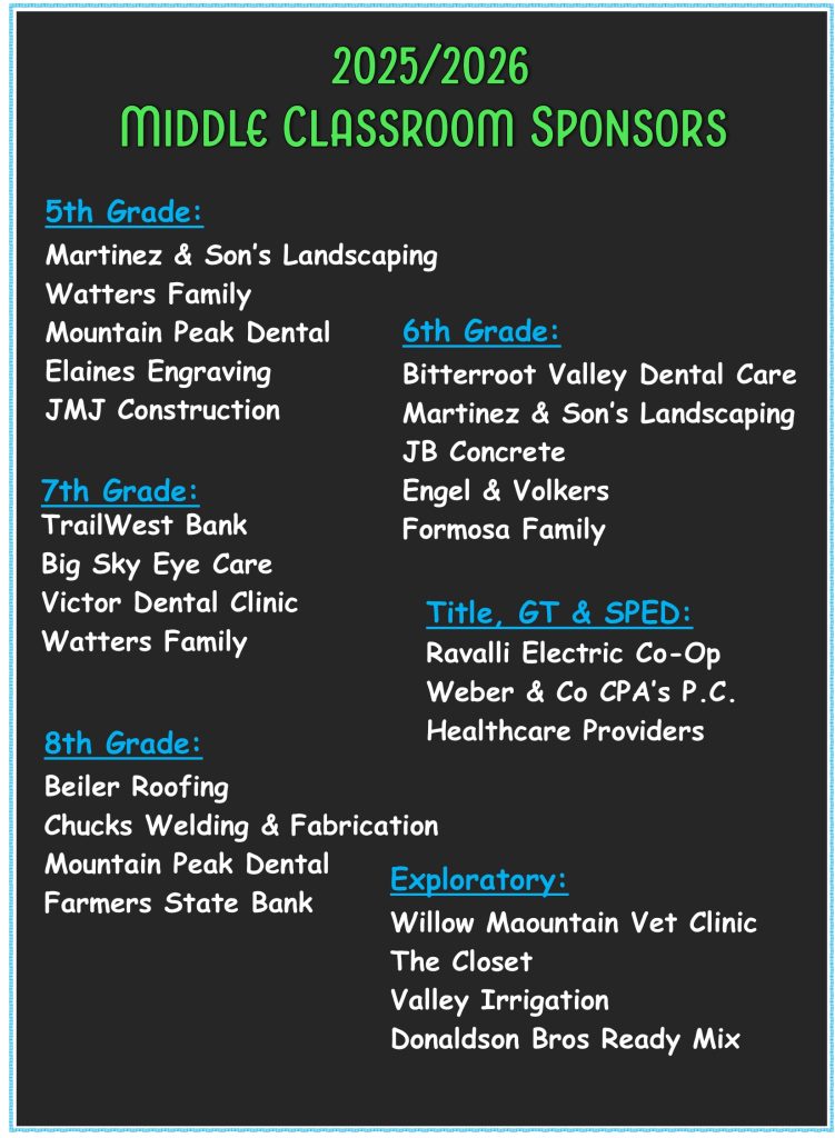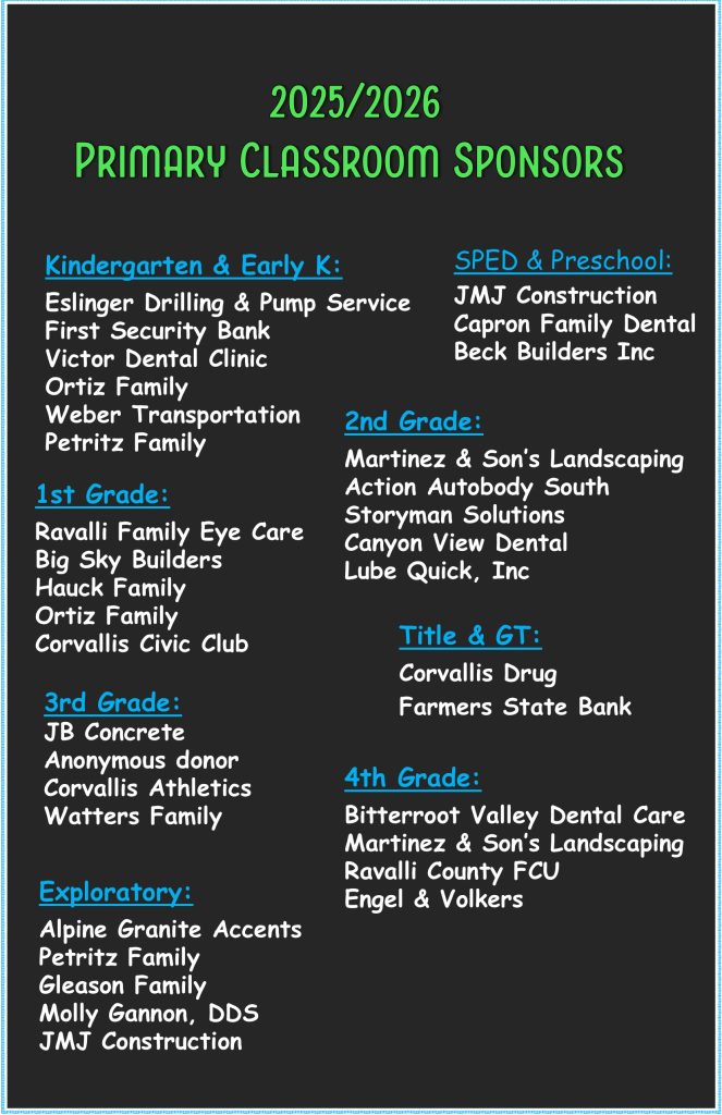 This school year our amazing Corvallis parents, grandparents, community members, and businesses funded 72 Classroom Sponsorships. These Classroom Sponsorships will help teachers fulfill their greatest classroom needs, enrich STEAM learning and provide teacher appreciation funding. Thank You!